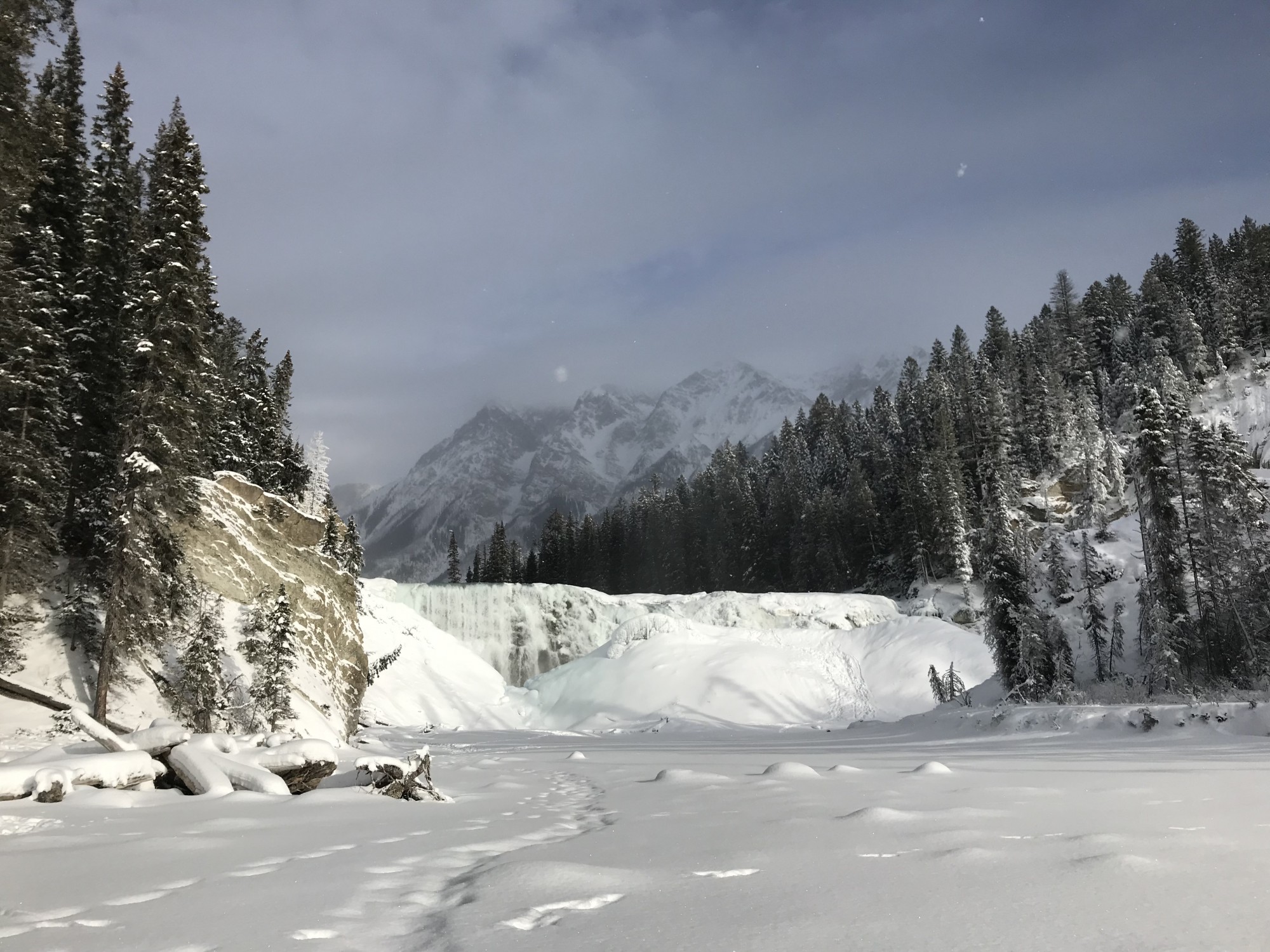 Our mission for the next few days was to go downhill and cross-country skiing. On the way to Golden we’d already hiked to the stunning Wapta Falls. In the summer, the mist from the thundering water cools you down. In the winter, that mist quickly settles making the outcrop at the base of the falls grow into a spectacular mountain of ice.