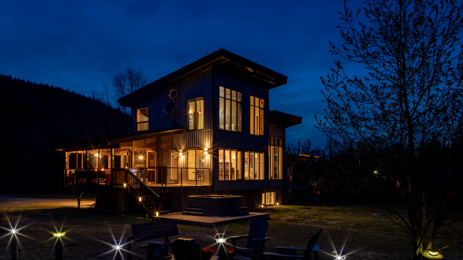 Located 7 km south of Golden, magnificent views, wildlife, and trails await. Perfect for romance or groups of up to 10. All are welcome in our custom 3-story home. Travel 25 minutes to ski at Kicking Horse Resort then return to connect with family and friends around the fire or in the hot tub.