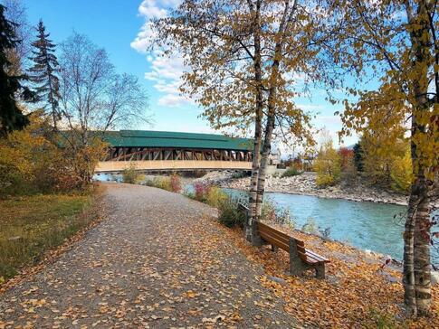 Sometimes it’s nice to get out of the car and stretch your legs, especially if the kids or the dog have restless energy! The Rotary Trail offers a short stroll or longer 7 km loop. Start in downtown at the Spirit Square and the Kicking Horse Pedestrian Bridge, the longest freestanding timber frame bridge in Canada. Take a short stroll towards the Golden Municipal Campground and back, admiring the Kicking Horse River and cheering any rafters or kayakers you might spot, or in the opposite direction towards the Confluence Park where the two historic Columbia and Kicking Horse rivers meet. The longer (but easy) loop includes wooded areas, stunning views of the Purcell mountains and lots of friendly locals.